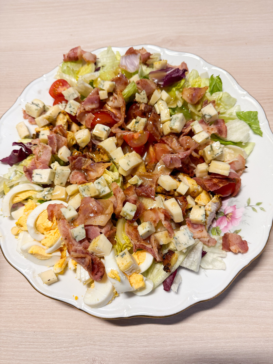 Чувство привычной кухни начинается с того, что каждый ингредиент выстраивается как в расписании: листья салата, куриная грудка, яйца, черри, бекон и сыр с плесенью — простая композиция, которая напоминает о домашнем обеде после трудного дня.