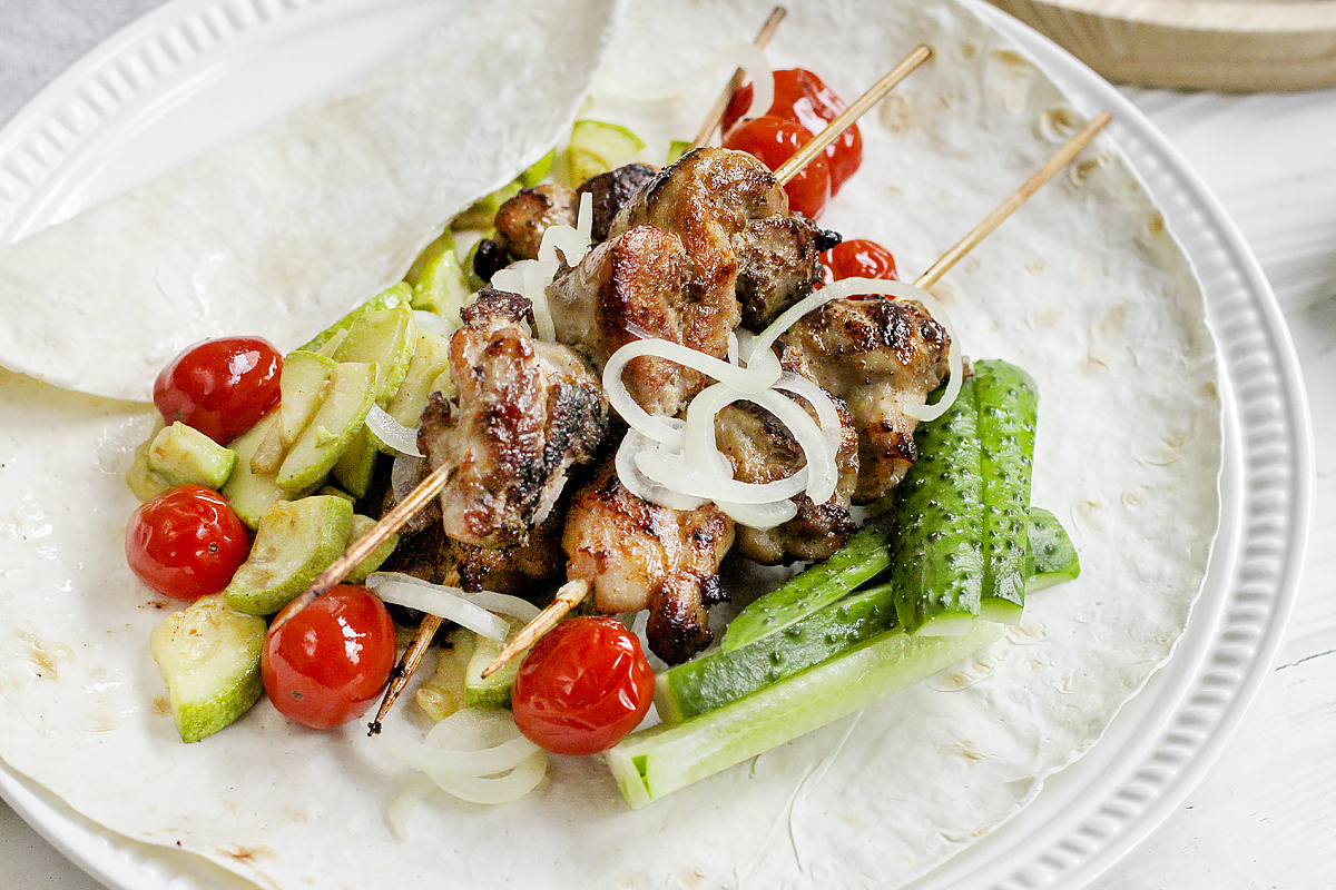 4. Подача: Огурцы нарезать соломкой. Лаваш предварительно подсушить, а затем выложить в него готовые овощи и маринованный лук, добавив шашлычки. Приятного аппетита!