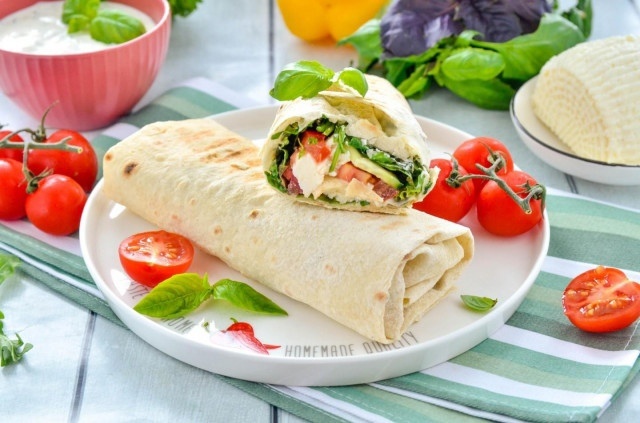 Шаг 1. Выберите тонкий лаваш, желательно большой. Для начинки подойдут средние помидоры и огурцы. Вам понадобятся любые листья салата — латук или руккола идеально подойдут. Мягкий сыр можно заменить на адыгейский или любой другой кавказский.