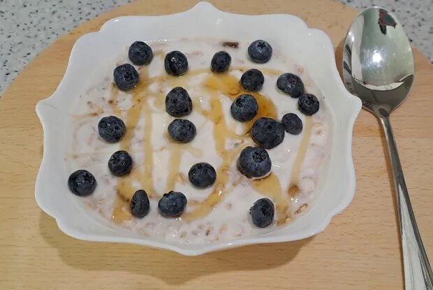 8. Утром, доставая готовое блюдо, добавьте 1 чайную ложку меда и 25 г голубики (или любые другие ягоды по вашему выбору).
