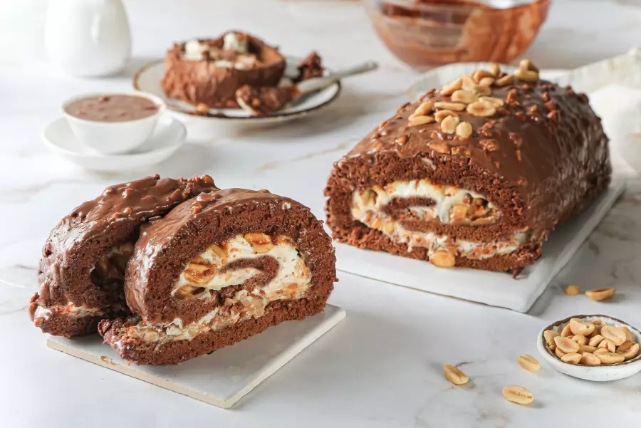 Этот бисквитный рулет 'Сникерс' станет настоящим хитом вашего застолья. Каждый кусочек перенесет вас в детство, подарив незабываемые эмоции и наслаждение сочетанием шоколадного, карамельного и солёного вкусов.