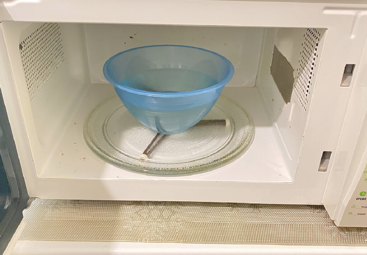 Перемешайте воду с содой до полного растворения, после чего поставьте смесь в микроволновую печь и установите на полную мощность на пять минут.