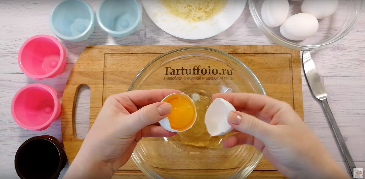 Каждый желток помещают в половинку скорлупы и ставят в форму для кексов. В это время белки взбиваются с добавлением небольшой щепотки соли до устойчивых пиков.