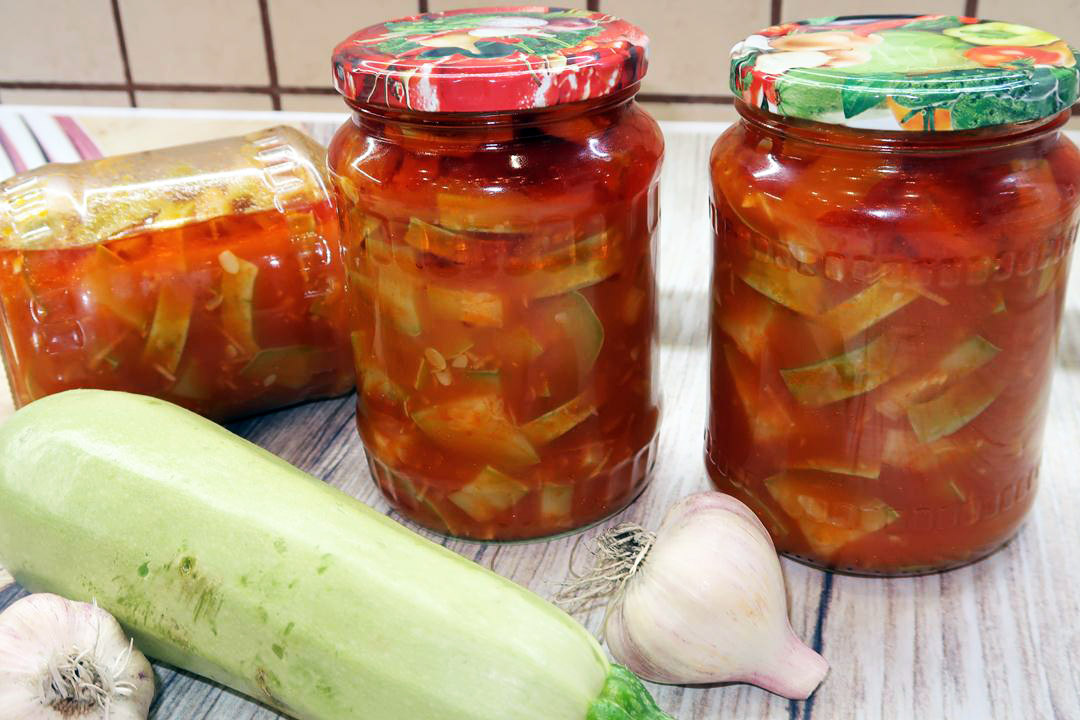 Пора готовить удивительный салат из кабачков с томатной пастой и чесноком на зиму. Это не только вкусно, но и необыкновенно красиво!
