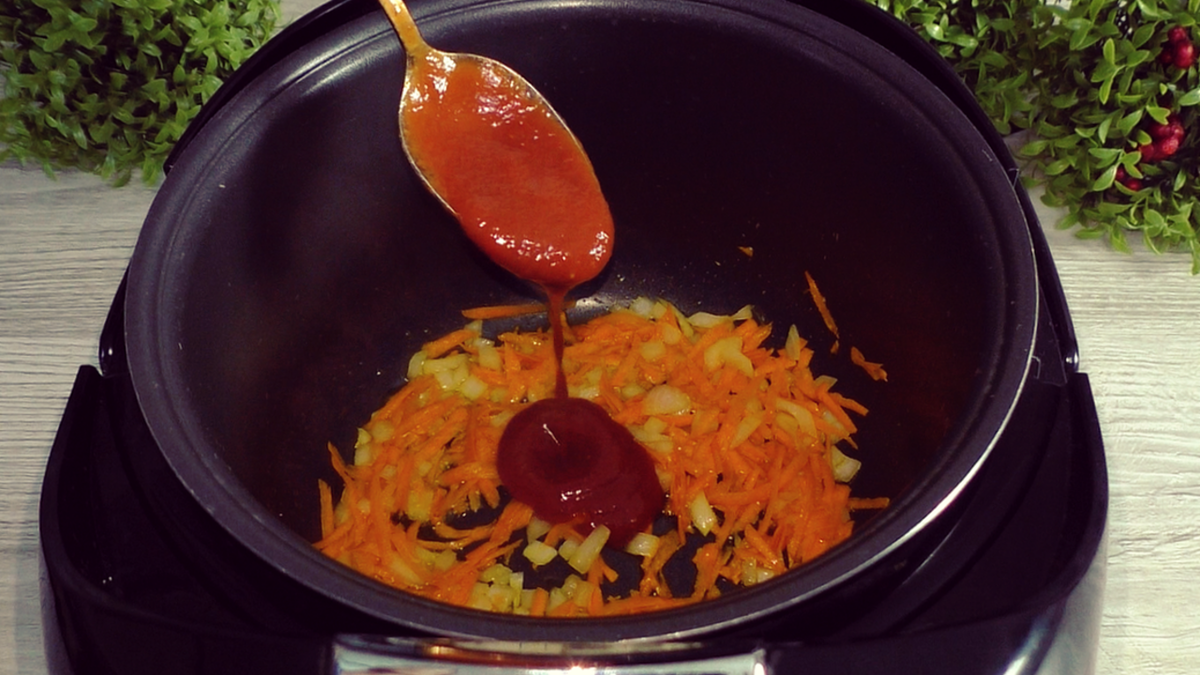После этого в чашу добавляется томатный соус или паста, которые нужно обжарить еще минуту, а затем выключить мультиварку.