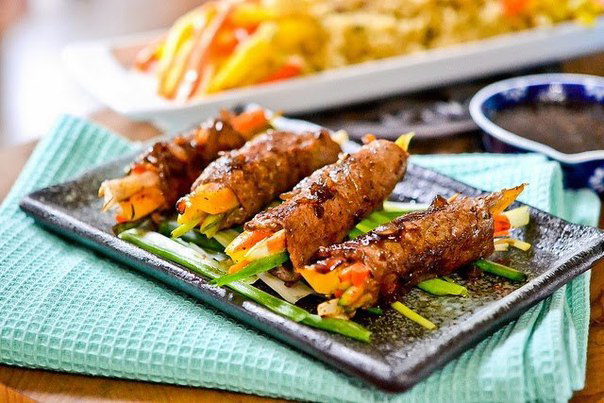Когда все ингредиенты готовы, обжарьте овощи в той же сковороде в течение 3 минут. Доставайте мясо из холодильника, выкладывайте внутрь овощную начинку и аккуратно скручивайте рулетики, скрепляя их зубочистками.