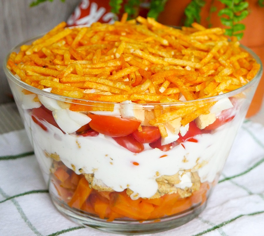 6. Выложить все ингредиенты слоями: морковь, курицу, соус, помидоры, яйца и сверху добавить чипсы.