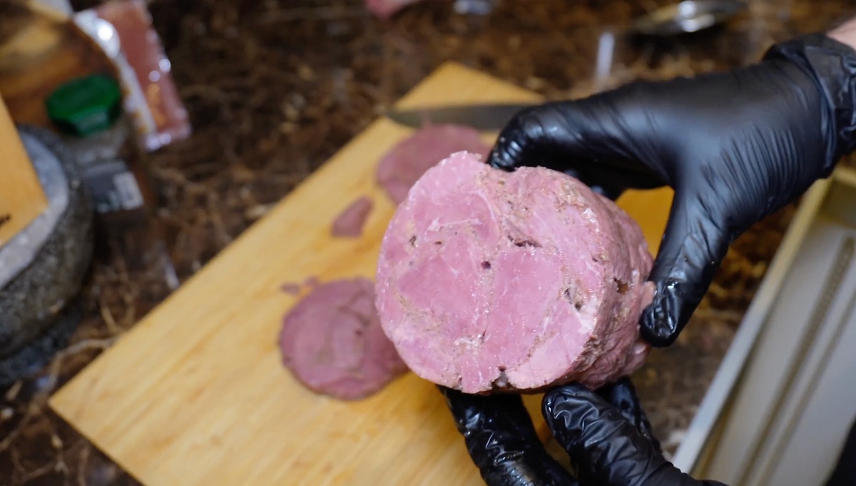 Подготовка мяса: Нарезать говядину на небольшие кусочки, предварительно убрав жир и пленки. Смешать мясо с обычной и нитритной солью, аккуратно вливая воду. Замесить массу в планетарном миксере на протяжении 10 минут, чтобы образовались соединительные волокна. Упаковать в пленку и оставить в холодильнике на сутки.Добавление специй: На следующий день к мясу добавить кориандр, мускатный орех, черный перец и сушеный чеснок. Как и в предыдущий раз, замесить в планетарном миксере. Подготовить ветчинницу, обернув её внутреннюю поверхность пакетиком для запекания, ввиду удобства извлечения готовой ветчины. Закрыть ветчинницу, вставить термометр и поместить в духовку, разогретую до 80°C, на 3 часа. Контролировать температуру, чтобы она достигла 69-72°C, что может занять до 6 часов.Охлаждение и подача: Как только ветчина готова, вынуть из духовки, дать остыть и оставить в холодильнике на ночь. На следующее утро, насладиться собственноручно приготовленной ветчиной!И вот, домашняя ветчина готова! В следующем видео будет представлен альтернативный способ приготовления, чтобы выяснить, какой из них окажется более вкусным, сообщает Дзен-канал "I PLOV YOU!".
