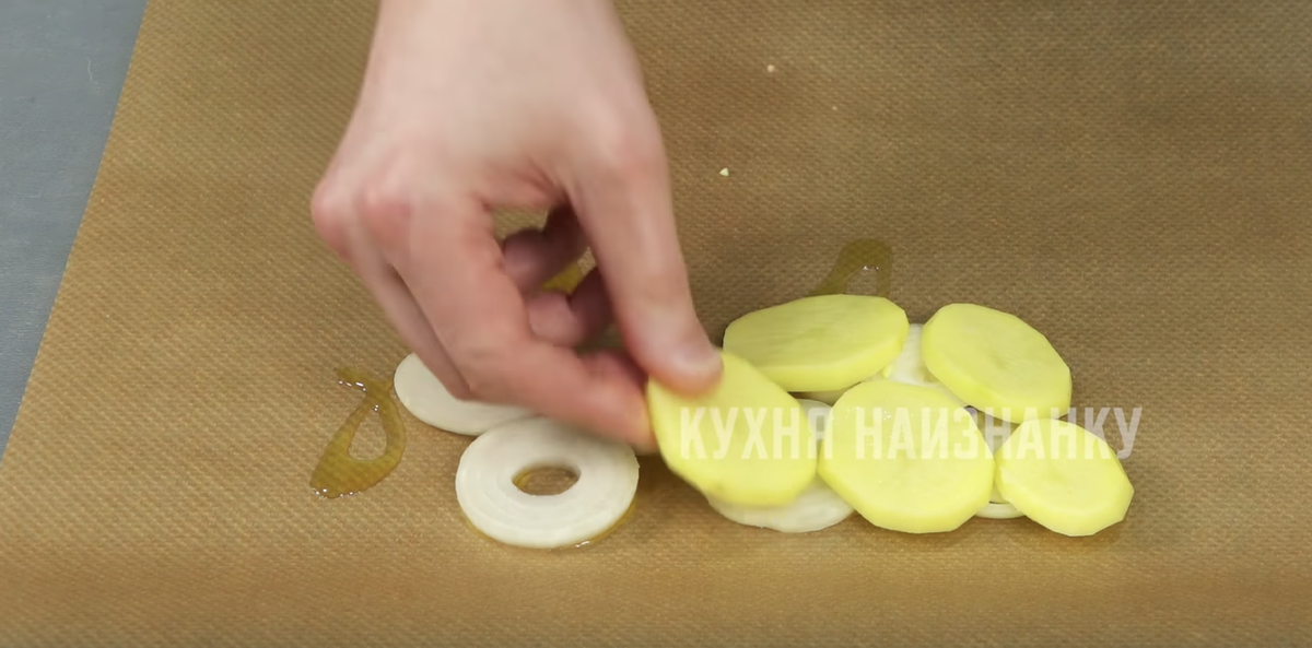 Далее, нарежьте кольцами лук и уложите его на пергамент. Сверху добавьте тонко нарезанный картофель и не забудьте немного его посолить. Учитывая вкусовые предпочтения, можно увеличить количество овощей, добавляя то, что нравится больше всего.