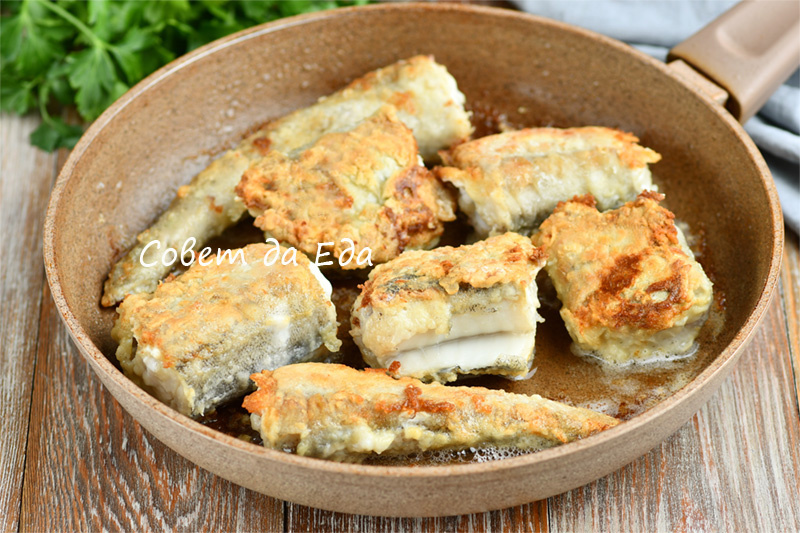 Для приготовления маринада взбивают яйца (2 шт.) с зубчиками чеснока (3 шт.), пропущенными через пресс. Минтай (700 г) разрезают на куски, приправляют солью и перцем, затем помещают в маринад. Оставить в холодильнике на пару часов или на ночь.