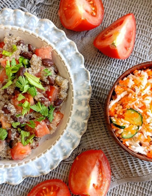 Блюдо из фасоли и киноа привлекает своей абсолютной питательной ценностью. Оно сочетает в себе бобовые, цельные злаки и свежие овощи. Для завершения этого кулинарного шедевра рекомендуется дополнить тарелку свежими салатами и ароматной зеленью.