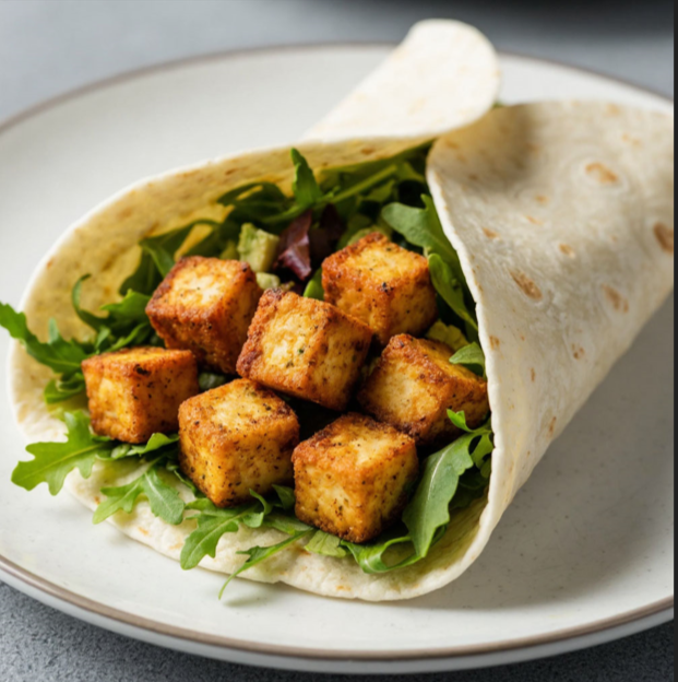 - Тем временем, на расколотый лист лаваша аккуратно выложить обжаренный тофу и свежую рукколу, придающую блюду легкость и свежесть. Сложите лаваш в рулет, аккуратно завернув начинку.