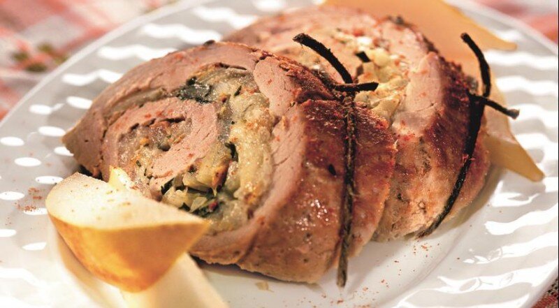 Выложить готовую начинку на мясо и аккуратно свернуть рулетом, следя за тем, чтобы начинка была полностью закрыта. Закрепить рулет кухонной нитью или зубочистками.