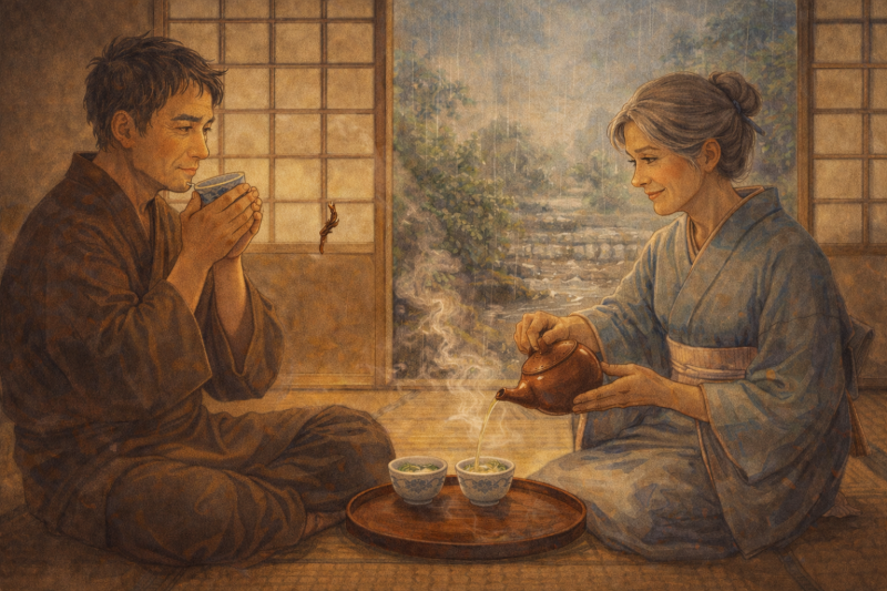 Кумико, не спеша, перелила горячую воду в чайник, давая листьям время размяться. Тихое шипение в наполняемом чайнике наполнило комнату первым, сладким ароматом. Когда он разлился по маленьким чашкам, она посмотрела на мужа, в её глазах отражались морщинки — следы радости и любви, подаренной ему за годы совместной жизни.