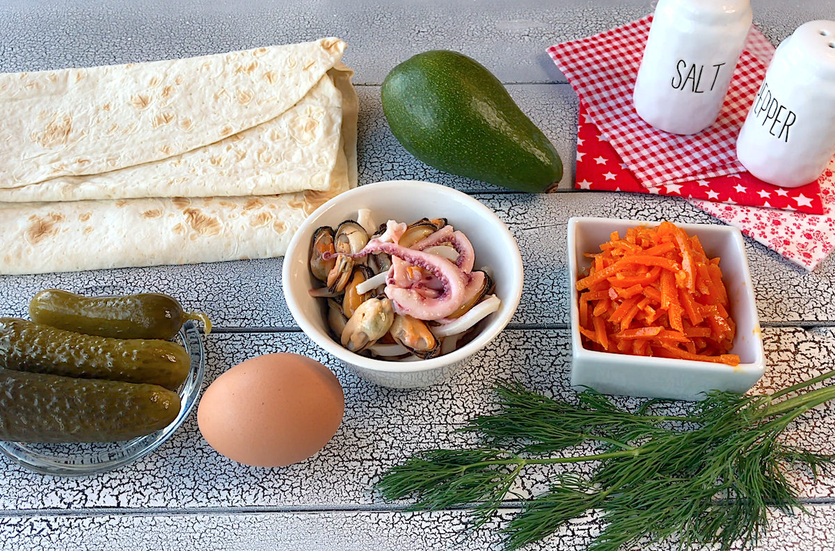 Начинка может варьироваться в зависимости от ваших предпочтений. Нежный авокадо, добавленный к морепродуктам, придаёт закуске особый вкус. Если авокадо не по душе, его можно заменить отварным картофелем или рисом.