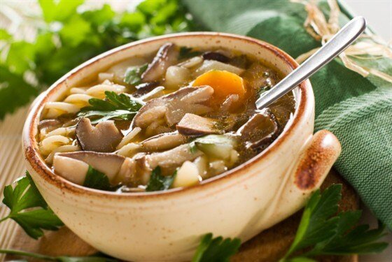 Картофель нужно порезать дольками и добавить к мясу с грибами. После 15 минут варки следует добавить обжарку из лука и моркови. Варить всего 5 минут, и суп готов!