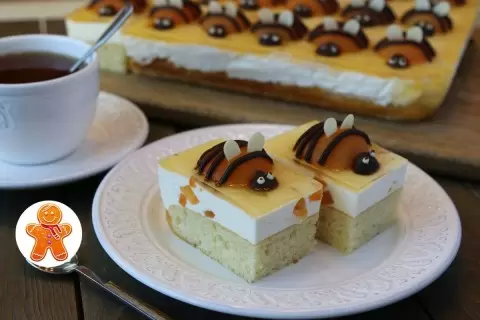 Для украшения подготовьте половинки абрикосов. Расплавленный шоколад можно использовать для создания "пчелок" — сделайте головки и крылышки, вставив в абрикосы миндальные лепестки. В завершение залейте пирог абрикосовым желе и дайте ему охладиться несколько часов в холодильнике.