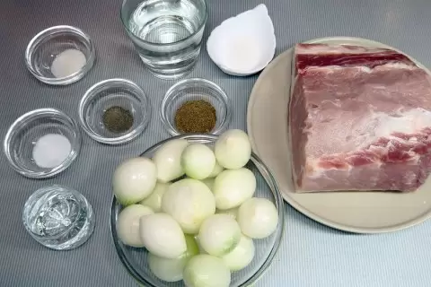 1. Лук необходимо тщательно очистить, промыть и разрезать вдоль пополам. Поместите нарезанный лук в глубокую емкость, добавьте сахар, соль и уксус, залейте горячей водой. Убедитесь, что лук полностью погружен в воду. Дайте ему настояться в течение 30-40 минут.
