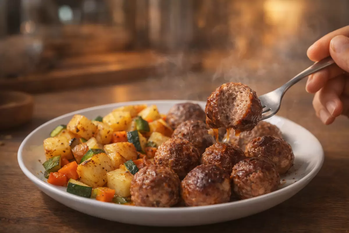 А еще, пока готовятся фрикадельки, можно одновременно подогреть гарнир — картофель, морковь или цукини, которые приготовятся за те же 15-18 минут на той же решетке.