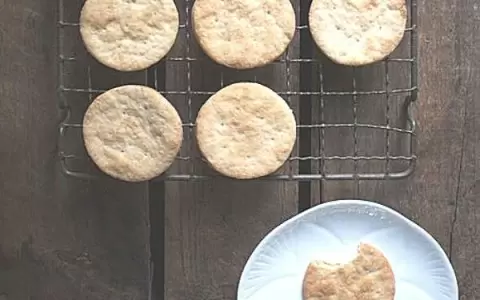 На хорошо присыпанной мукой поверхности раскатайте тесто, нарежьте его на круглые печенья (9 см в диаметре). Прокалите каждое печенье вилкой и выложите на противень. Выпекайте в разогретой духовке около 10 минут, пока печенье слегка не зарумянится.