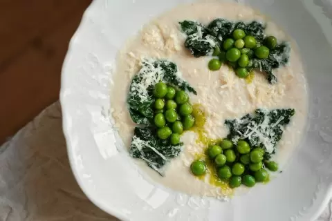 Перед подачей в готовый суп добавляют жидкий дым и сухой рыбный бульон хондаши, которые придадут особую пикантность. Не забудьте быстро обжарить шпинат с чесночным маслом и солью, чтобы он сохранил свою яркость и текстуру. Готовый суп сервируют, украсив обжаренными шпинатом и натертым пармезаном, а рядом выкладывают молодой зеленый горошек, который добавит свежести и цвета блюду.