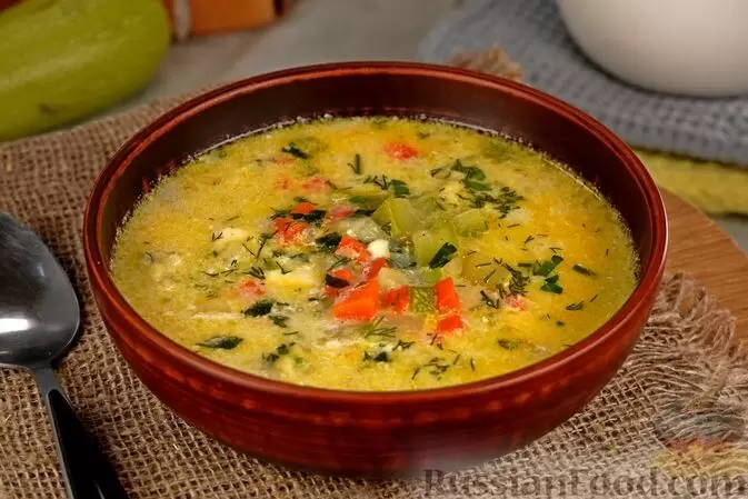 - Сырный суп с кабачками, помидорами и кукурузой: Содержит только овощи и плавленый сыр, что делает его лёгким и ярким, идеально подходящим для осеннего ужина.