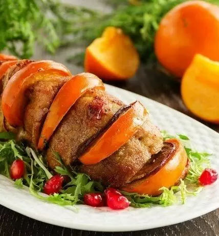 5. Каждое углубление в мясе заполняется ломтиками хурмы, яблока и лука, что добавит оригинальности и сладости блюду.