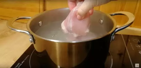 Первым делом куриные бедра отвариваются в подсоленной воде. В зависимости от выбора мяса, процесс займет около 30 минут для бедер и 15 для грудок. Пока варится курица, можно заняться грибами. Лук мелко нарезают и обжаривают на растительном масле до золотистого цвета, после чего к нему добавляют предварительно отваренные грибы. Жарят все вместе еще на протяжении пяти минут.