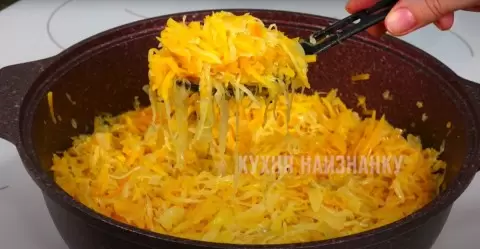 - После того как капуста станет мягкой, добавьте натертую тыкву в сковороду.