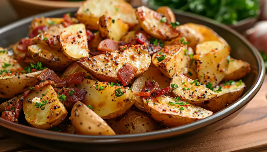 После выпекания картошка обретет аппетитный золотистый цвет, а бекон станет хрустящим. Подавайте блюдо горячим, щедро посыпав свежей рубленой зеленью. Это потрясающее сочетание пряного картофеля и копченого бекона по праву заслужило свою популярность и может стать звездой вашего стола.