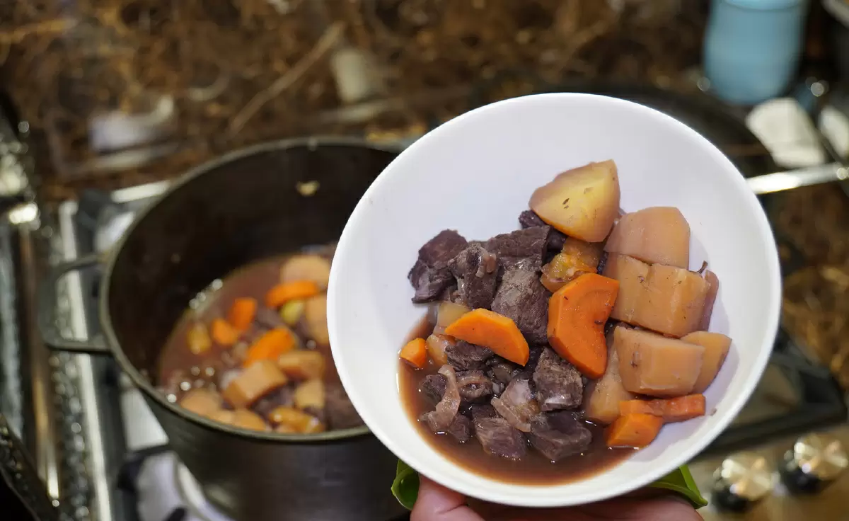 Доведите до кипения, накройте крышкой и томите на медленном огне в течение одного часа. После этого проверьте готовность картофеля и мягкость мяса. Обычно, часа вполне достаточно!