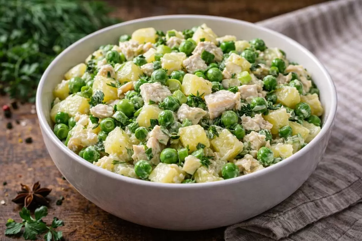 Причина популярности подобных салатов в их простоте и гармонии. Картофель придаёт блюду насыщенность, рыба дарит вкус, горошек добавляет нежности, а зелень привносит свежесть. Все компоненты прекрасно сочетаются и не создают конфликтов.