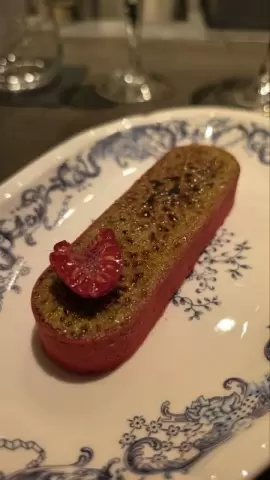 Фисташковый ганаш радует своей тягучестью и насыщенным вкусом. Под ним располагается легкий малиновый кули, который добавляет свежесть и нотки кислинки. Хрустящий корпус завершается этой гармонией, придавая десерту многослойность, что позволяет ощутить каждую деталь на языке.