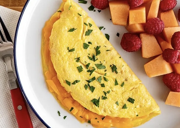 Приготовление: Взбить яйца с молоком, разогреть сковороду, смазать маслом. Вылить смесь, готовить на среднем огне 2-3 минуты, затем сложить пополам и подавать.