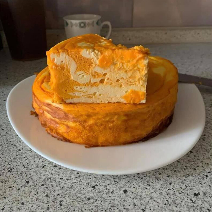 Далее следует подготовить форму. Смазываем её кокосовым маслом и начинаем выкладывать слоями: сначала творожную массу, затем тыквенную. Повторяем до тех пор, пока не использованы все ингредиенты. Для создания красивого рисунка можно аккуратно провести палочкой по верхнему слою.