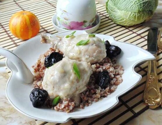 Готовое блюдо отлично сочетается с любым гарниром. Для идеального дополнения подойдет гречневая каша, которая подчеркнет вкус курицы с черносливом.