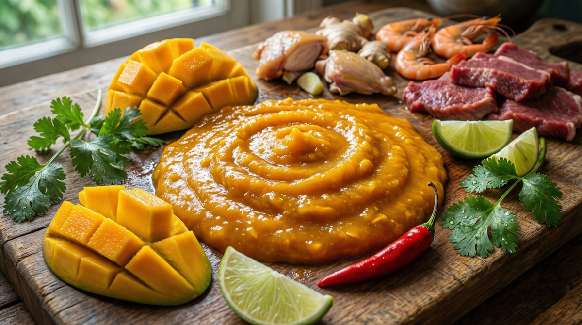 Основа удачного маринада — зрелый, но не перезрелый плод: сорта альфонсо, кесар или атаульфо идеально подходят благодаря плотной, ароматной мякоти. В манго содержатся натуральные ферменты (папаин и бромелайн), которые размягчают волокна мяса, а фруктовая сладость даёт базу для сочетаний с лаймом, чили и пряностями. При отсутствии свежих плодов годятся кусочки в собственном соку или качественное манговое пюре без сахара.