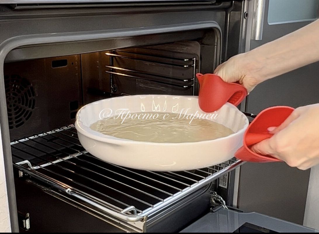 Готовое тесто выложите в предварительно смазанную форму и поместите в разогретую до 180°C духовку. Выпекайте около 30 минут. Время выпекания может варьироваться в зависимости от размера формы: если она меньше 28 см в диаметре, пирог будет выше, и потребуется немного больше времени.
