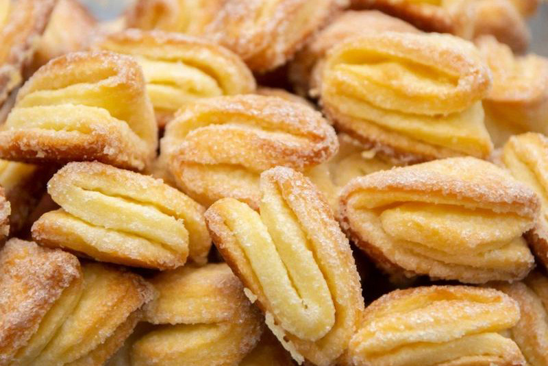Каждое печенье обмакивается в сахар с корицей с одной стороны, затем складывается пополам и снова обмакивается с одной стороны. Процесс повторяется еще раз, после чего печенье принимает форму треугольника. Обратите внимание, тесто не стоит уплотнять.