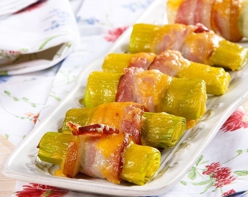 3. Формирование трубочек: Обернуть кусочки лука-порея в полосы грудинки и выложить в подготовленную форму для запекания «швом» вниз. Посыпать сверху тертым сыром и запекать до того момента, как сыр расплавится. Можно также подготовить соус из нежирной сметаны и сливок в равных пропорциях, добавив немного рубленой зелени (например, укропа или петрушки) и тертого сыра. Посолить и поперчить по вкусу.