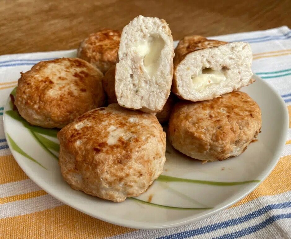 Сформировать из фарша небольшие шарики, придавая им плоскую форму. Укладываем на них кубики сыра и аккуратно защипываем фарш, чтобы сыр оказался внутри.