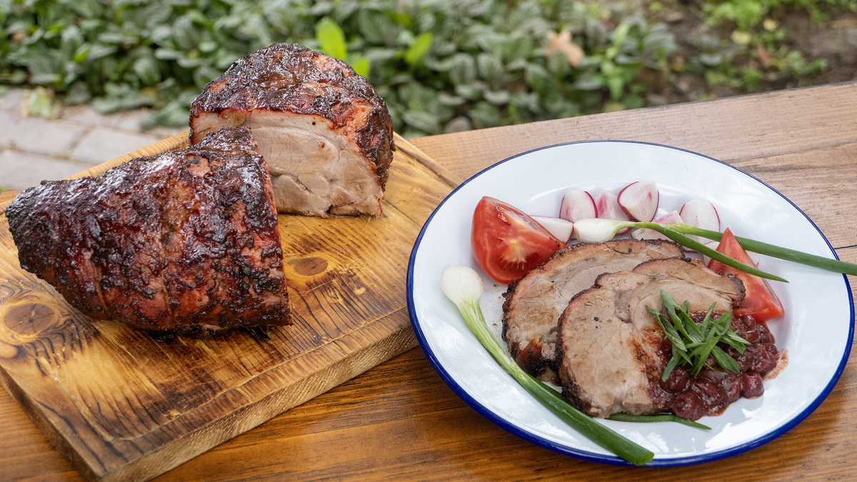 Шаг 4: После готовности, освободите свиное мясо от шпагата, дайте ему «отдохнуть» около 10 минут, затем нарежьте и подавайте с вишневым соусом и любимыми овощами. Приятного аппетита!