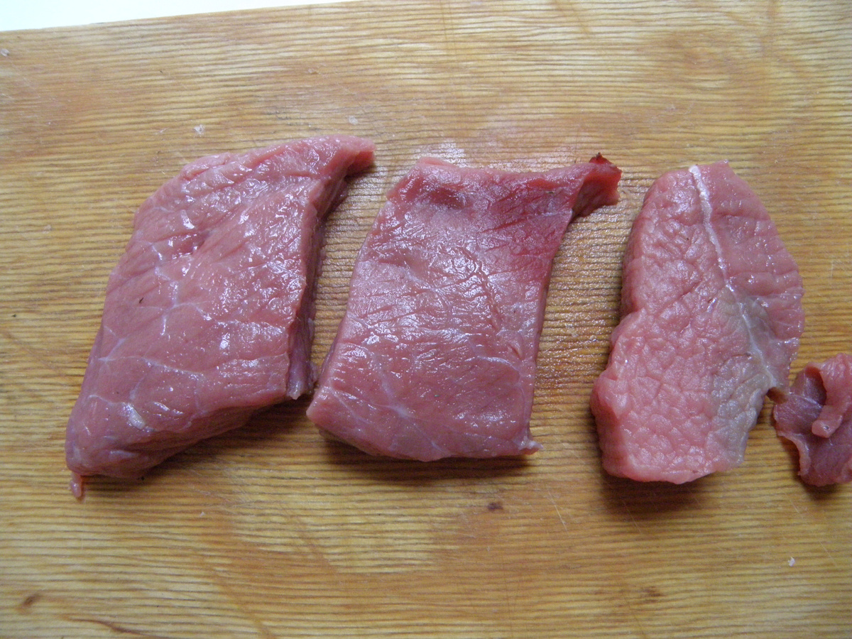 1. Мясо нарезается на куски нужной толщины, предпочтительно не менее 2 см. Затем нужно отбить его, упаковав в пакет, чтобы сохранить чистоту. Важно не переусердствовать с ударами.