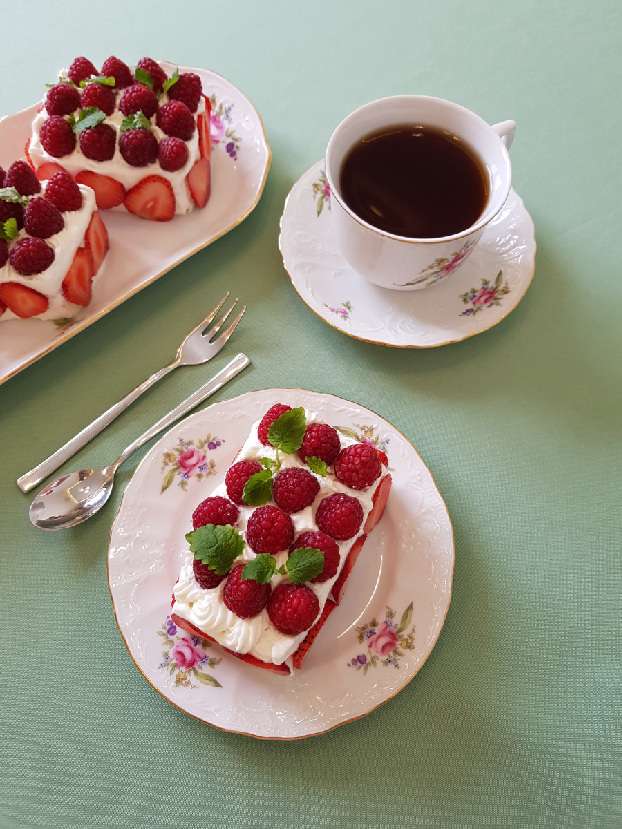 2. Разрезать торт на 8 порционных прямоугольников. Украсить каждое пирожное сливками, клубникой и малиной, дополнить листьями мяты.