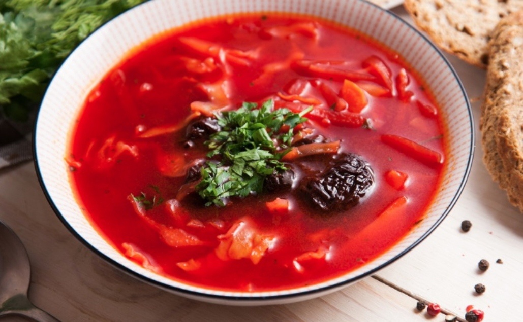 Свеклу нужно натереть, залить холодной водой, добавить уксус и томить на медленном огне. Капусту нарезать, чернослив и морковь подготовить и обжарить, после чего добавить все ингредиенты в кастрюлю, довести до кипения и варить в течение 20 минут. Не забудьте добавить зелень при подаче.