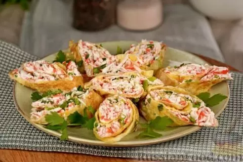 Яичные рулетики с крабовыми палочками. Эти легкие и воздушные рулетики из яичных блинчиков с начинкой из крабовых палочек моментально наполнят ваше утро солнечным настроением. Промажьте блинчики майонезом, добавьте немного зеленого лука, сверните в аккуратные рулетики и нарежьте на порционные кусочки. Приятно удивить семью такой закуской на завтрак — просто и эффектно!