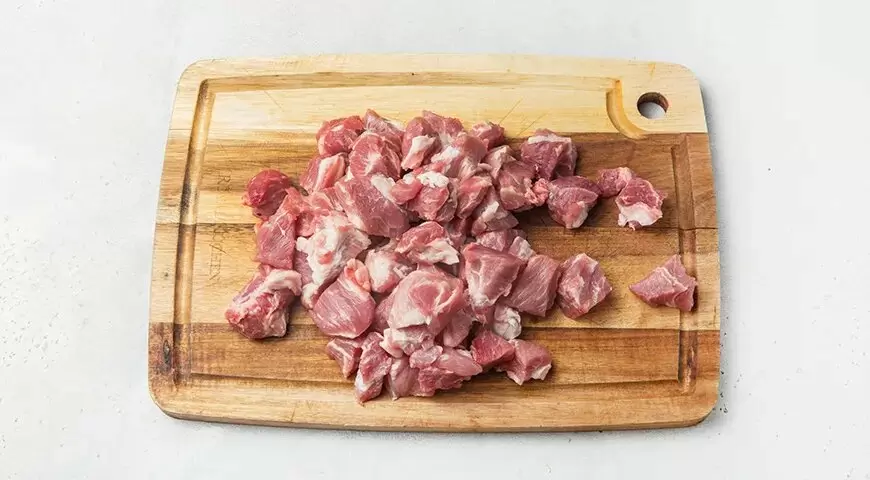 Для начала свинину нужно тщательно обработать: обрезать все пленки и сухожилия, затем нарезать мясо на кубики размером 2 см. Положите мясные кусочки в миску и добавьте немного соевого соуса, перемешайте их, чтобы соус хорошо пропитал мясо, и оставьте мариноваться.