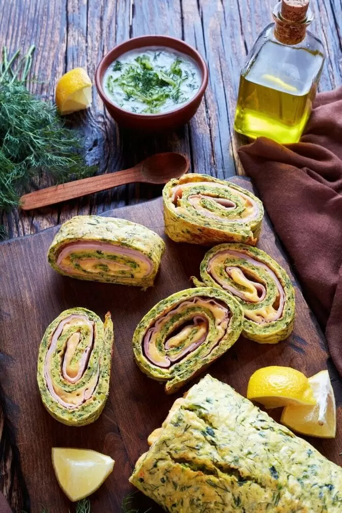 Финальные штрихи: Достайте рулет из духовки и оставьте охладиться на доске, предварительно застеленной пергаментом. Накройте одну половину рулета ломтиками сыра, затем добавьте ветчину и аккуратно скатайте рулет с помощью бумаги.