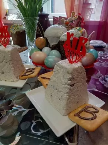 На 100 г творожной пасхи: 285 ккал; белки – 12,4 г, жиры – 20,6 г, углеводы – 12,0 г (из них клетчатка – 1,7 г, натуральные сахара – 7,0 г, крахмал и другие углеводы – 3,3 г).