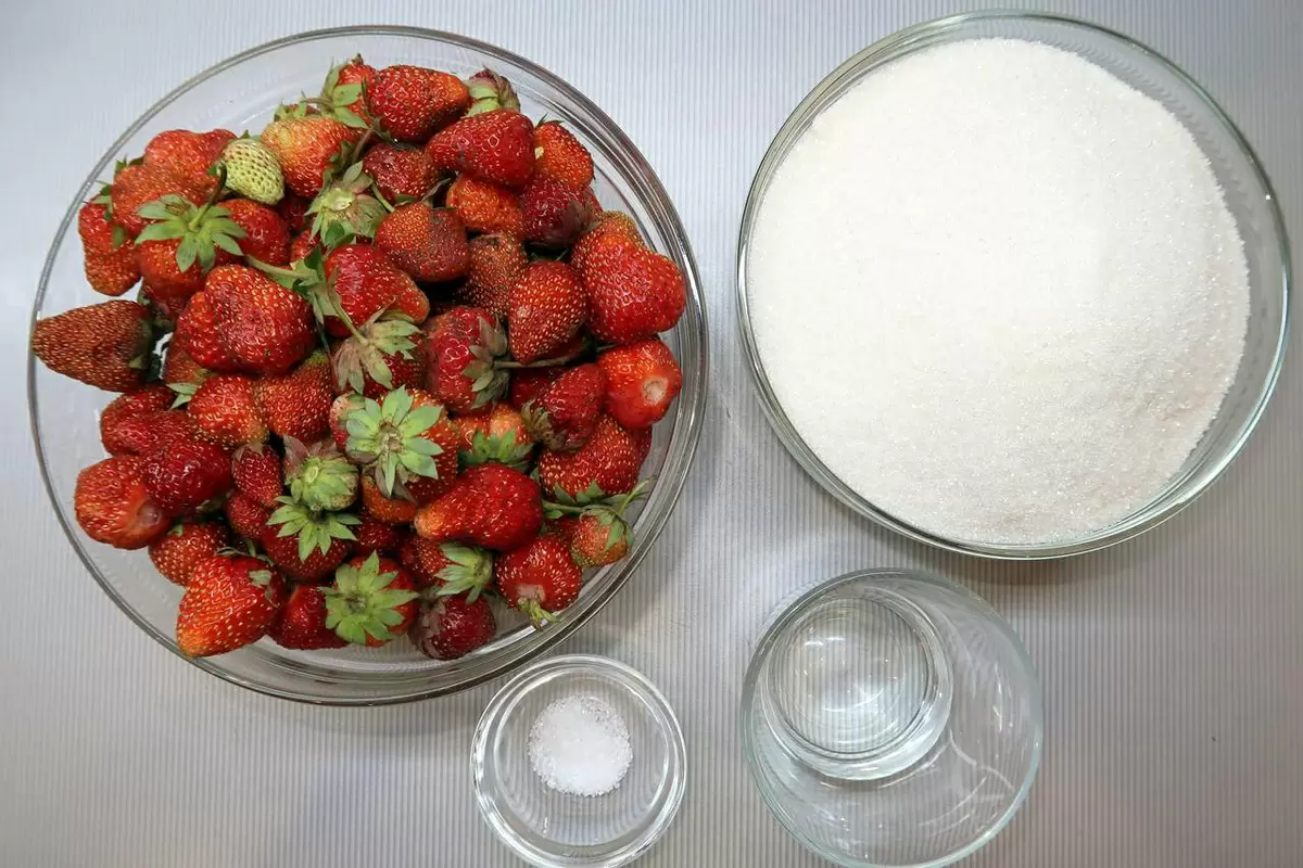 Далее, в кастрюлю из нержавеющей стали налейте немного воды и высыпьте клубнику. Для достижения идеального вкуса рекомендуется использовать 4 порции сахара, по 250 граммов каждая. Первую порцию сахара необходимо добавить к ягодам вместе с лимонной кислотой.